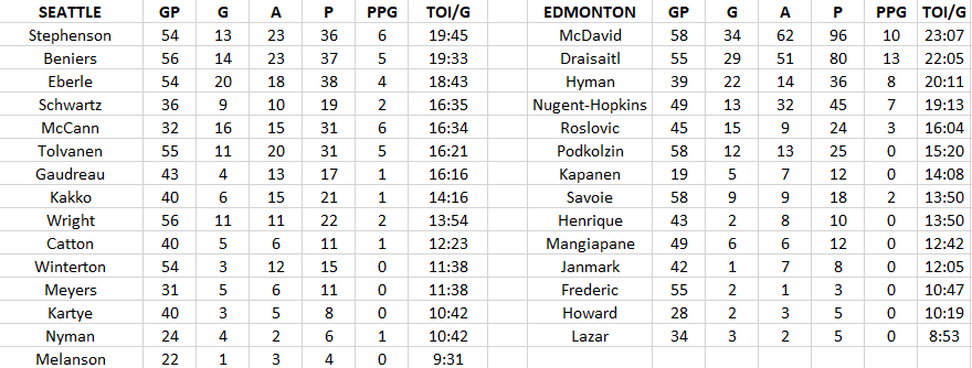 Seattle plays their third line a bit more, mainly because it doesn’t have a dominant first line. They have one 20-goal scorer and no players with 40 points. Edmonton’s top six TOI forwards have more EV/PK goals than Seattle’s top six have in total goals.