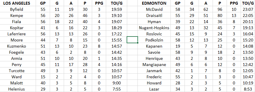 The remaining Kings forwards have 51 goals with 13 on the PP and 38 at EV/PK, which is significantly more than Edmonton’s 28 and 2.