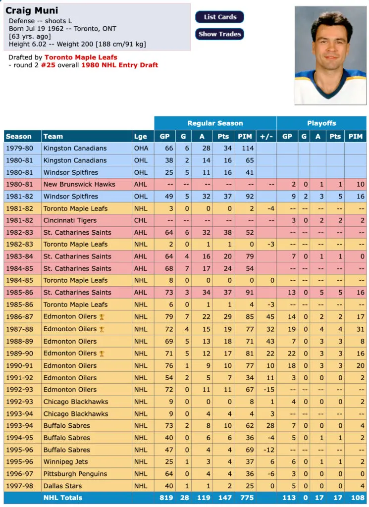 As Lowetide alluded to in a Nation Profile years ago, Muni would be property of four NHL teams in October 1986. The Oilers signed him as a free agent on August 18th of that year, sold his rights to the Buffalo Sabres for cash on October 2nd, who did the same a day later, sending him to the Pittsburgh Penguins.