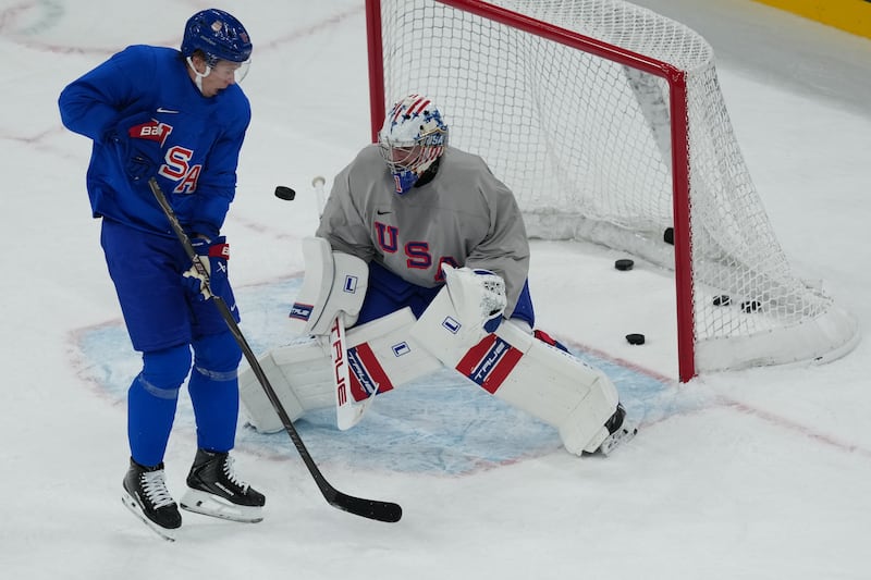 United States’ Matt Boldy looks to the puck as United States’ goalkeeper Jeremy Swayman defends during men’s ice hockey practice at the 2026 Winter Olympics, in Milan, Italy, Sunday, Feb. 8, 2026. (AP Photo/Carolyn Kaster)