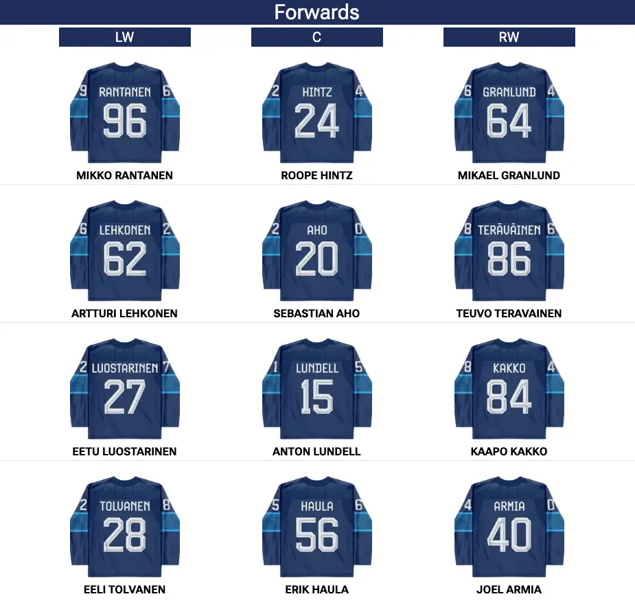 Mikael Granlund: Playing on a line with Mikko Rantanen, Granlund is really going to have to excel offensively if he’s going to stand out. However, Granlund was arguably the Finns’ best player at last year’s 4 Nations Face-off, finishing the tournament with three goals and four points, including the overtime winner against the Swedes in Game 2 of the Round Robin. We’ll see if he can continue that dominance, now playing in a clear offensive role, with two former Dallas Stars teammates in Rantanen and Roope Hintz.