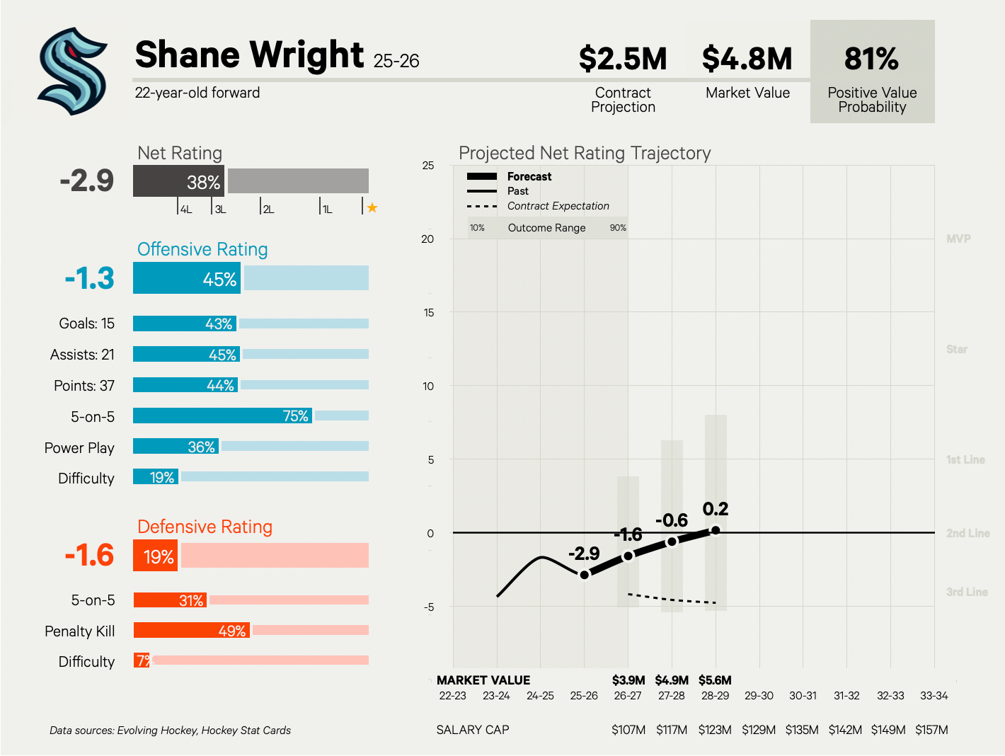 But some of the flaws are even more glaring — like the fact that his all-situations scoring pace has slowed (from 2.38 points per 60 to 1.70) after his shooting percentage dipped below 20 percent this season. Wright doesn’t consistently drive play into the offensive zone, either; AllThreeZones’ tracking has him below average in controlled entries among forwards this year.