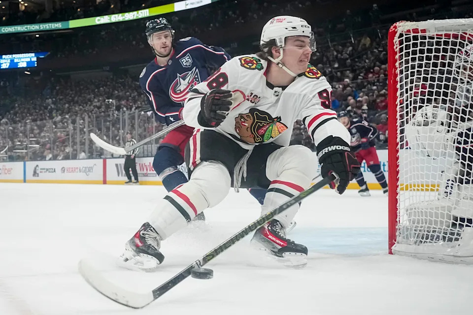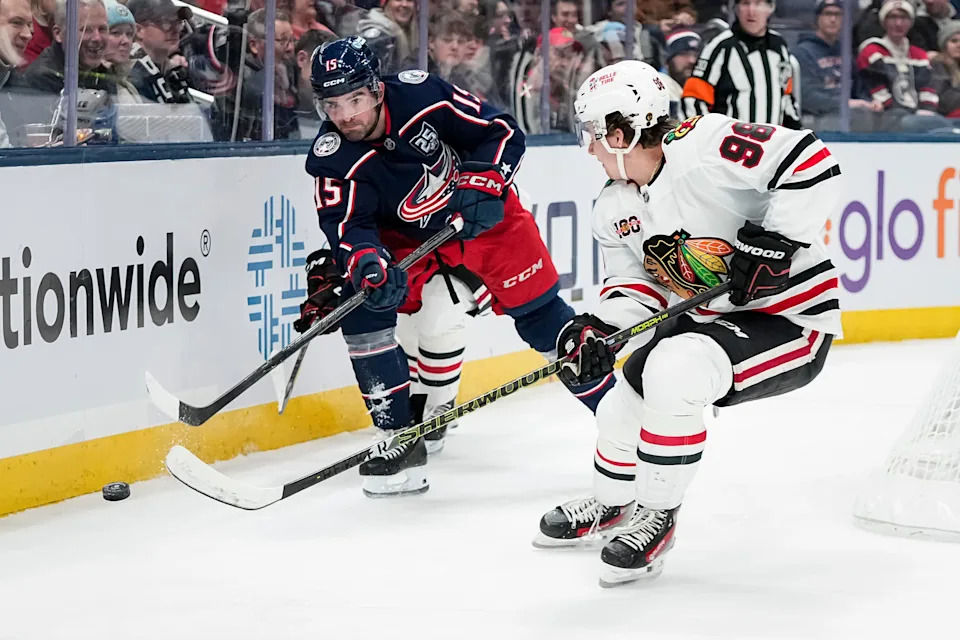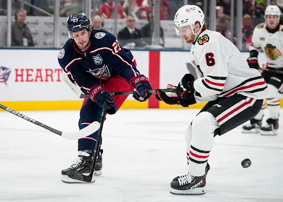 Columbus Blue Jackets center Kent Johnson (91) passes over Chicago Blackhawks defenseman Matt Grzelcyk (48) during the first period of the NHL hockey game at Nationwide Arena on Feb. 4, 2026.