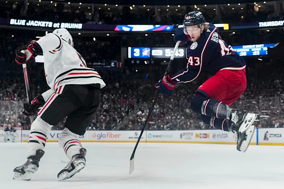 Columbus Blue Jackets left wing Danton Heinen (43) leaps as Chicago Blackhawks defenseman Connor Murphy (5) moves the puck during the NHL hockey game at Nationwide Arena on Feb. 4, 2026. The Blue Jackets won 4-0.