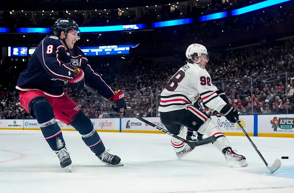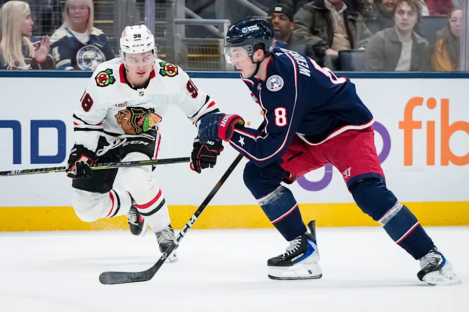 Columbus Blue Jackets defenseman Zach Werenski (8) chases a puck past Chicago Blackhawks center Connor Bedard (98) during the second period of the NHL hockey game at Nationwide Arena on Feb. 4, 2026.