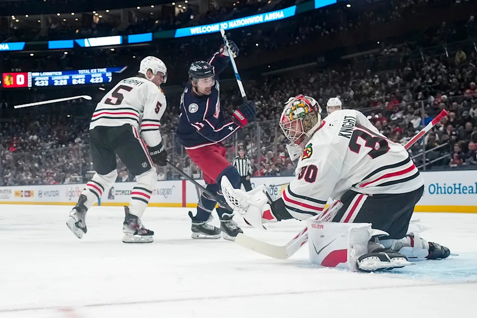 Chicago Blackhawks goaltender Spencer Knight (30) makes a save as Columbus Blue Jackets left wing Miles Wood (11) breaks his stick in front of defenseman Connor Murphy (5) during the NHL hockey game at Nationwide Arena on Feb. 4, 2026. The Blue Jackets won 4-0.