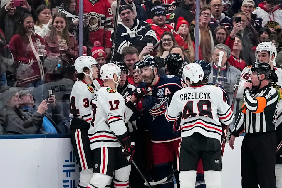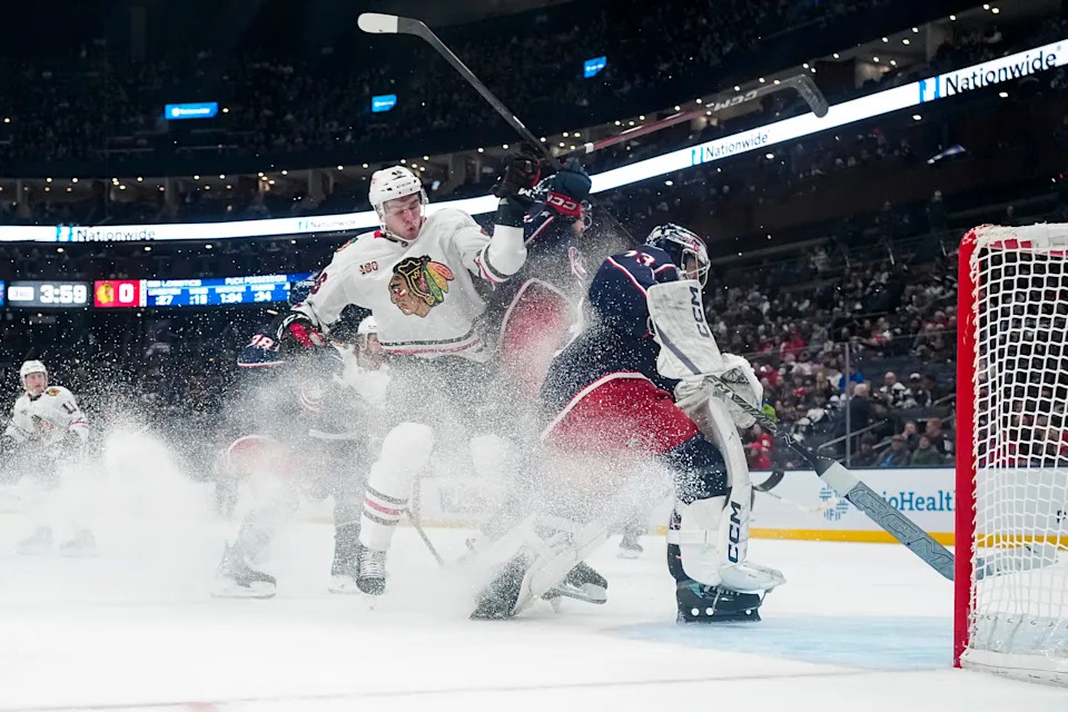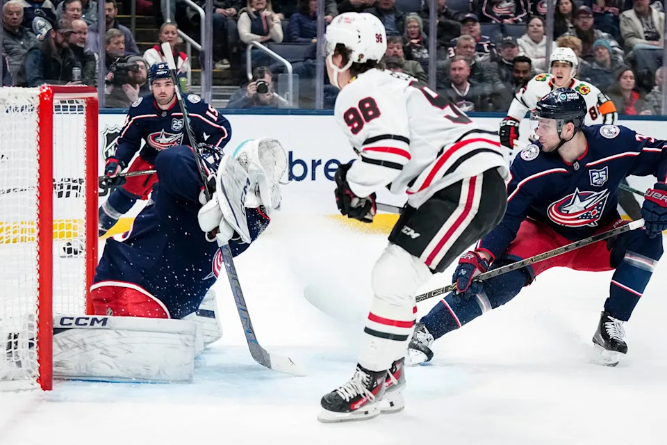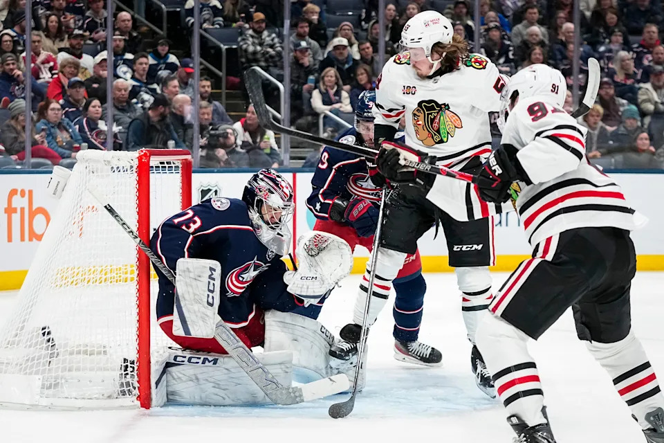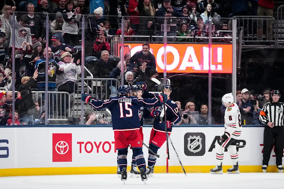 The Columbus Blue Jackets take on the Chicago Blackhawks during the third period of the NHL hockey game at Nationwide Arena on Feb. 4, 2026. The Blue Jackets won 4-0.
