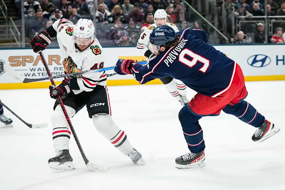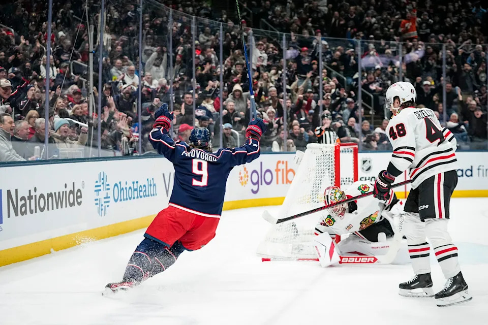 Columbus Blue Jackets defenseman Ivan Provorov (9) scores past Chicago Blackhawks defenseman Matt Grzelcyk (48) during the first period of the NHL hockey game at Nationwide Arena on Feb. 4, 2026.