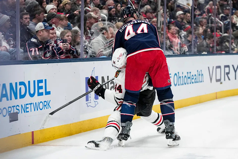 Columbus Blue Jackets defenseman Erik Gudbranson (44) hits Chicago Blackhawks center Colton Dach (34) during the second period of the NHL hockey game at Nationwide Arena on Feb. 4, 2026.