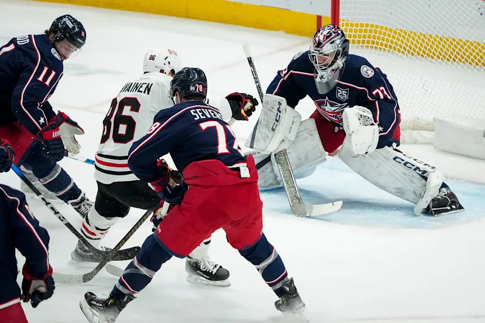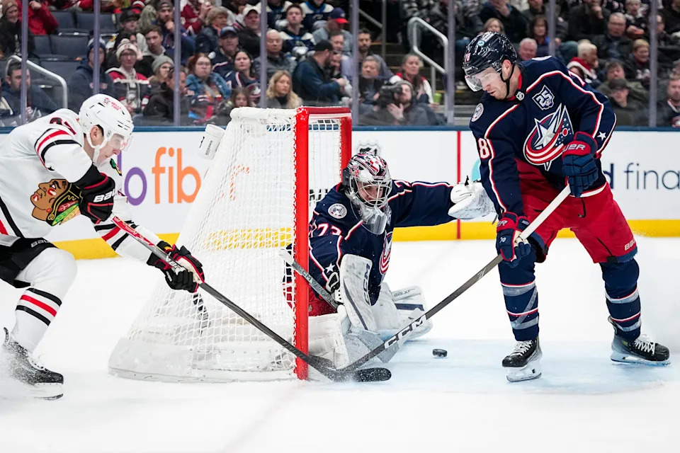 Columbus Blue Jackets goaltender Jet Greaves (73) stops a shot from Chicago Blackhawks right wing Ilya Mikheyev (95) wtih help from defenseman Damon Severson (78) during the second period of the NHL hockey game at Nationwide Arena on Feb. 4, 2026.