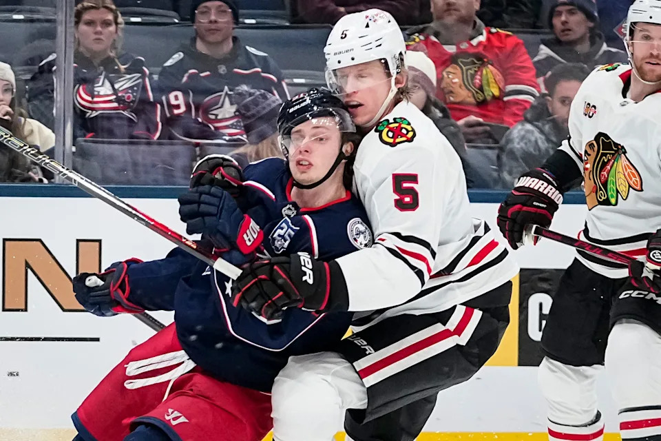 Columbus Blue Jackets center Kent Johnson (91) hits Chicago Blackhawks defenseman Connor Murphy (5) during the third period of the NHL hockey game at Nationwide Arena on Feb. 4, 2026. The Blue Jackets won 4-0.