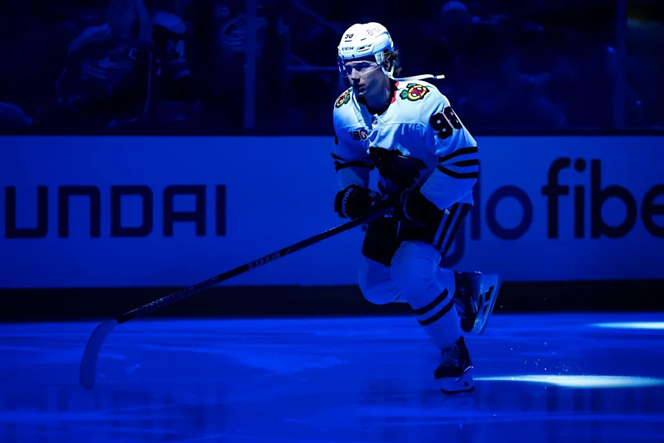 Chicago Blackhawks center Connor Bedard (98) takes the ice for the NHL hockey game against the Columbus Blue Jackets at Nationwide Arena on Feb. 4, 2026.