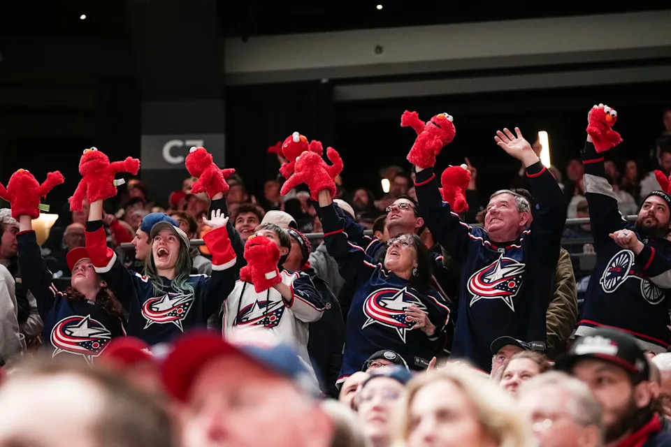 Fans hold Elmo puppets during the third period of the NHL hockey game between the Columbus Blue Jackets and the Chicago Blackhawks at Nationwide Arena on Feb. 4, 2026. The Blue Jackets won 4-0.