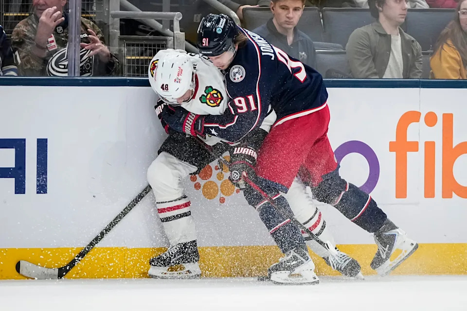 Columbus Blue Jackets center Kent Johnson (91) hits Chicago Blackhawks defenseman Matt Grzelcyk (48) during the third period of the NHL hockey game at Nationwide Arena on Feb. 4, 2026. The Blue Jackets won 4-0.