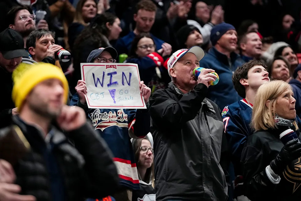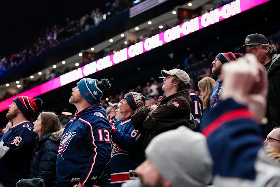 Fans celebrate a goal by Columbus Blue Jackets defenseman Zach Werenski (8) during the first period of the NHL hockey game against the Chicago Blackhawks at Nationwide Arena on Feb. 4, 2026.