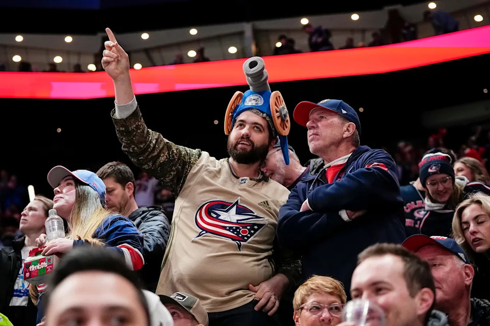 Fans celebrate a goal by Columbus Blue Jackets defenseman Ivan Provorov (9) during the first period of the NHL hockey game against the Chicago Blackhawks at Nationwide Arena on Feb. 4, 2026.