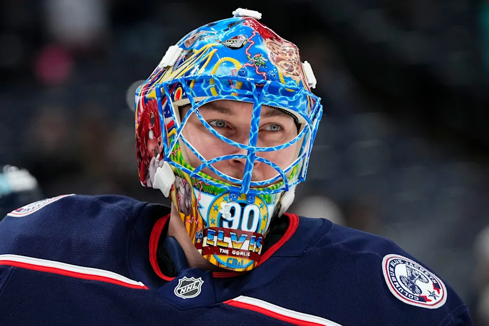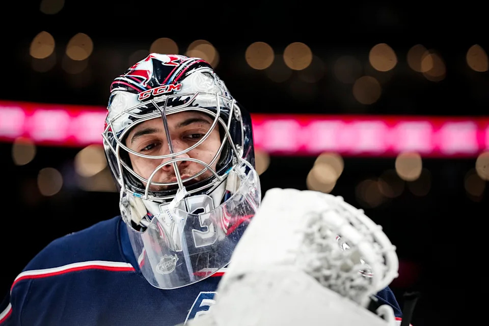 Columbus Blue Jackets goaltender Elvis Merzlikins (90) warms up prior to the NHL hockey game against the Chicago Blackhawks at Nationwide Arena on Feb. 4, 2026.
