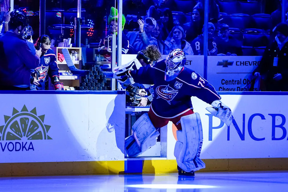 Columbus Blue Jackets goaltender Jet Greaves (73) takes the ice during warm ups prior to the NHL hockey game against the Chicago Blackhawks at Nationwide Arena on Feb. 4, 2026.