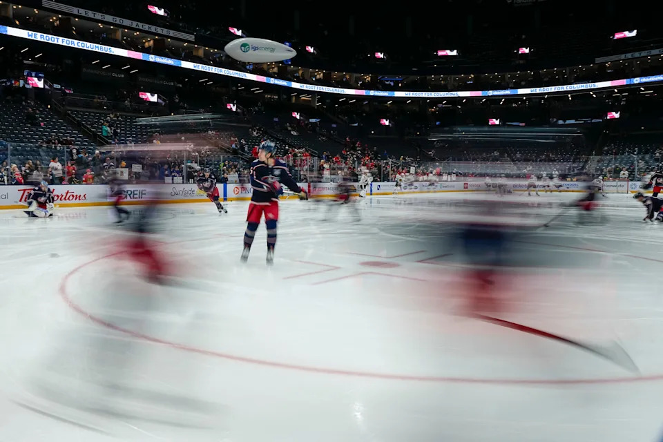 The Columbus Blue Jackets warm up prior to the NHL hockey game against the Chicago Blackhawks at Nationwide Arena on Feb. 4, 2026.