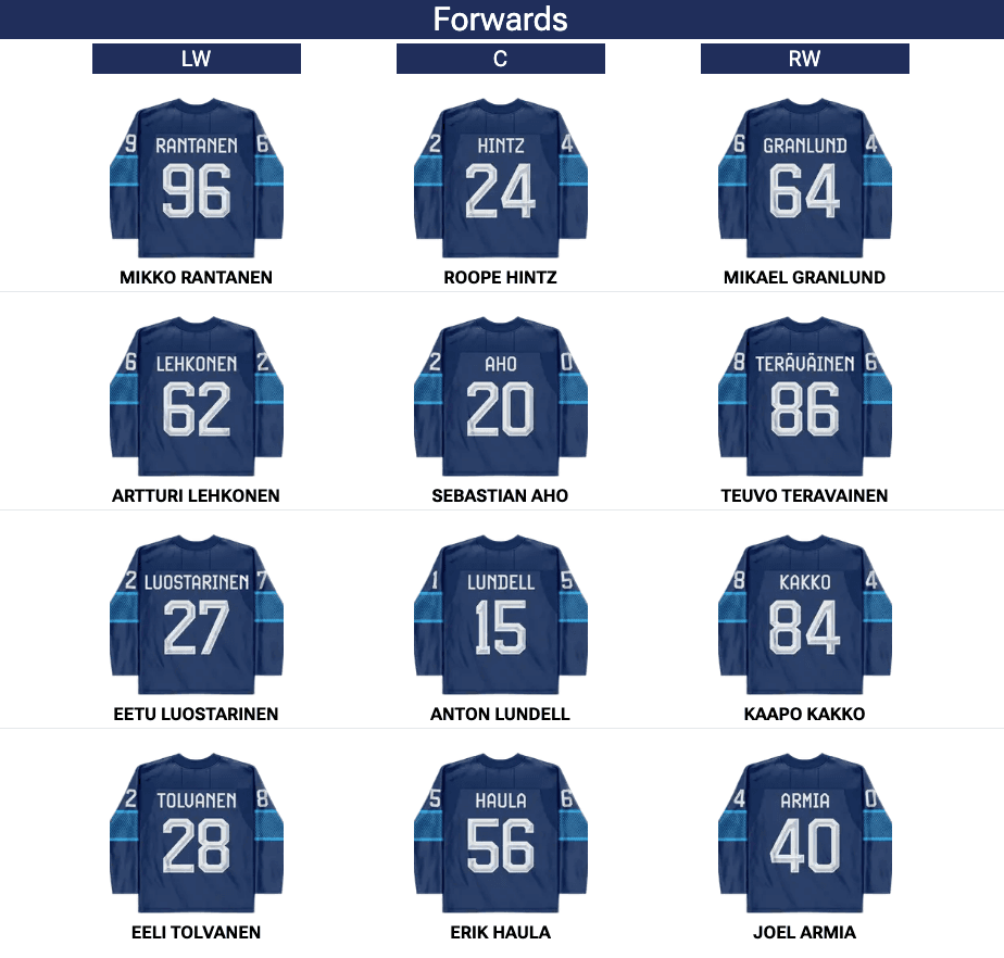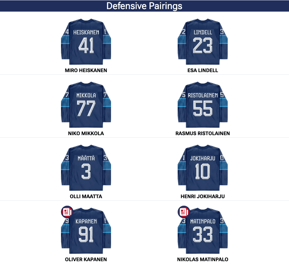Finland is making some changes. Oliver Kapanen replaces Joel Kiviranta as the 13th forward, while Nikolas Matinpalo will step in for Mikko Lehtonen as the seventh defenceman.
