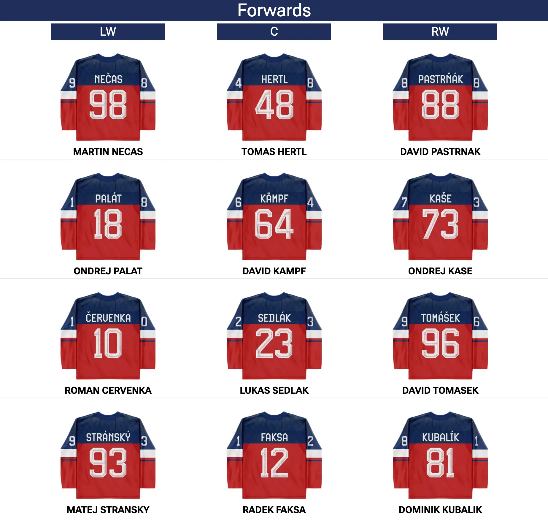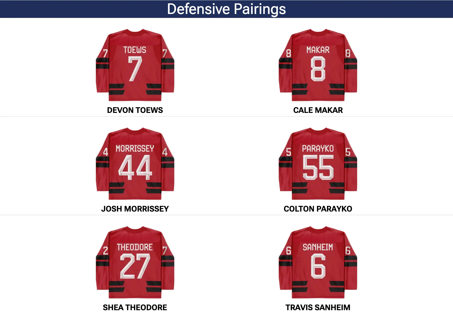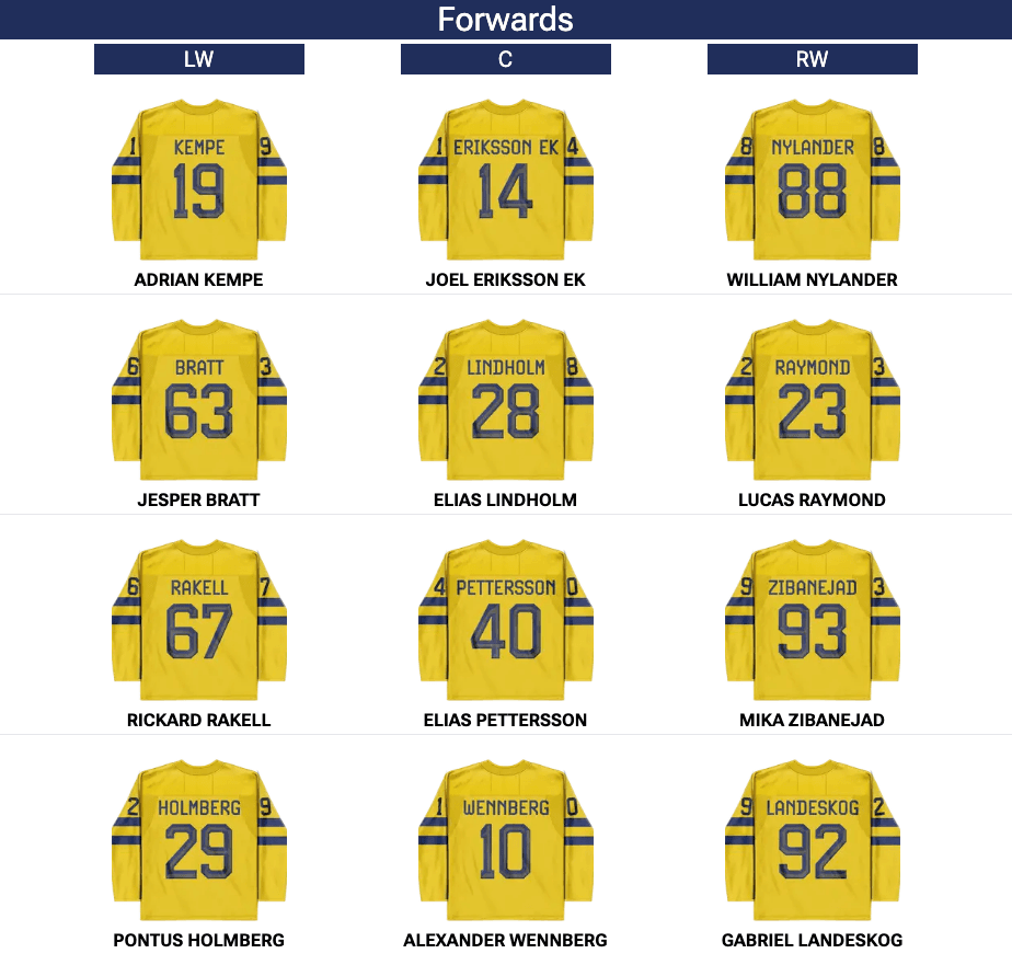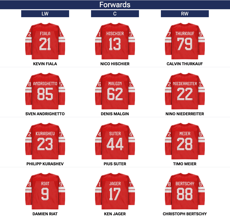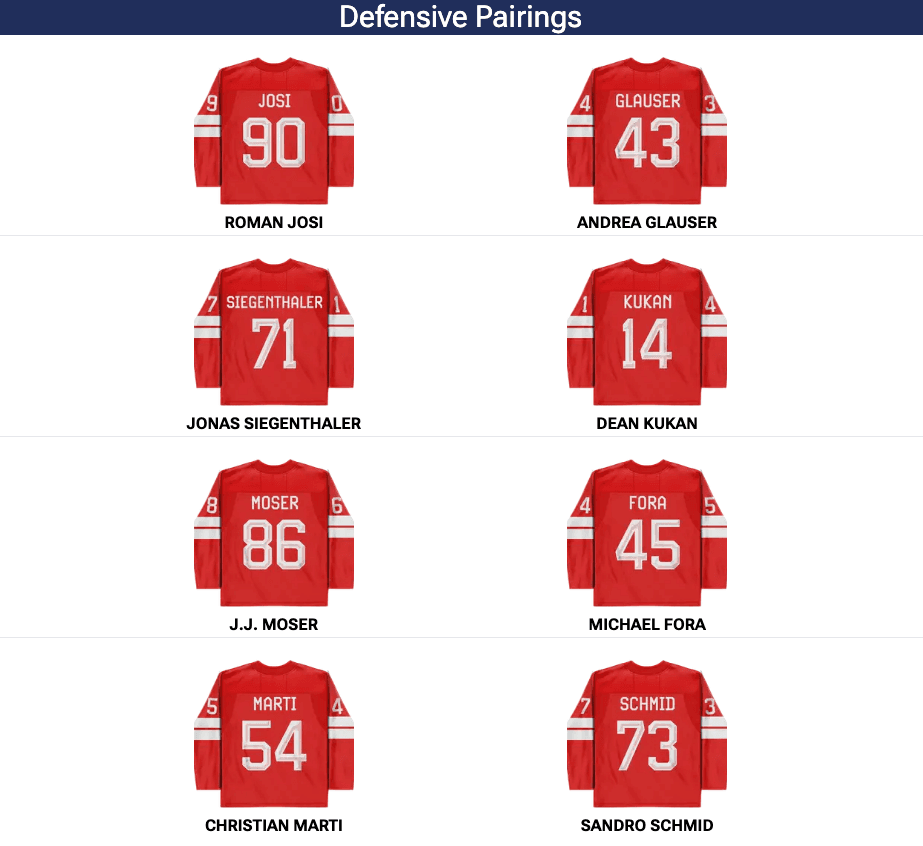 Josh Morrissey was injured on Thursday against the Czechs. There is no update on his status. If he is forced to miss this match against the Swiss, expect Travis Sanheim to make his Olympic debut as the seventh defenceman. *Drew Doughty and Thomas Harley, who made up the third pair against Czechia, are not listed in the photo but will play.