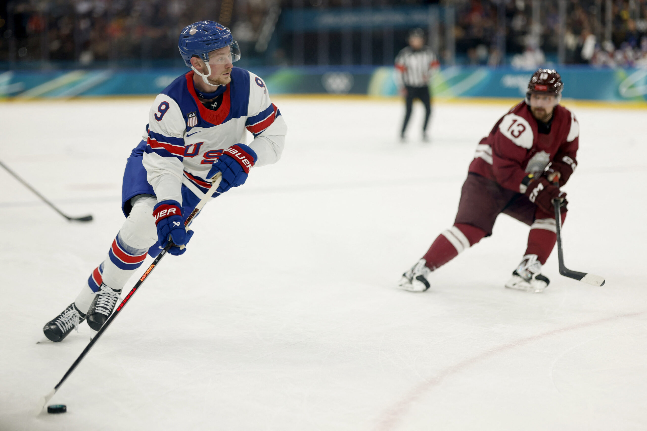 Feb 12, 2026; Milan, Italy; Matthew Tkachuk of United States in action with Renars Krastenbergs of Latvia in men’s ice hockey group C play during the Milano Cortina 2026 Olympic Winter Games at Milano Santagiulia Ice Hockey Arena. Mandatory Credit: Geoff Burke-Imagn Images