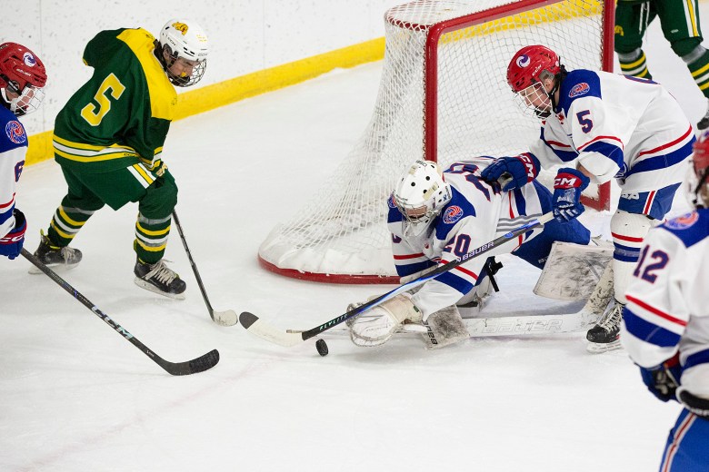 Hartford goalie Kaleb Sanderson (20) reaches to grab the puck during a Philippe H. Bouthillier Holiday Classic matchup against Burr and Burton Academy at Wendell A. Barwood Arena in White River Junction, Vt., on Tuesday, Dec. 30, 2025. Burr and Burton won, 2-1. ALEX DRIEHAUS / Valley News