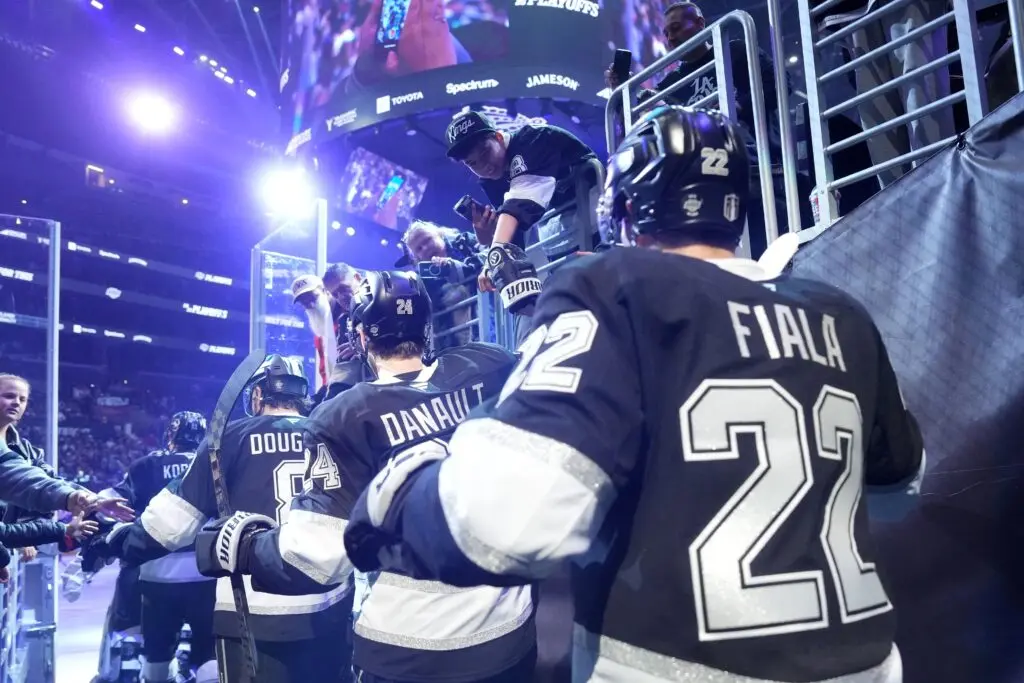 Apr 21, 2025; Los Angeles, California, USA; LA Kings center Phillip Danault (24) and left wing Kevin Fiala (22) enter the ice during game one of the first round of the 2025 Stanley Cup Playoffs against the Edmonton Oilers at Crypto.com Arena. Mandatory Credit: Kirby Lee-Imagn Images