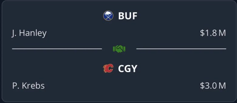 Kicking things off, we have Joel Hanley heading to the Buffalo Sabres for Calgary-born Peyton Krebs. Krebs is a 25-year-old centre who will be an RFA at the end of the season. The Flames are looking to get younger, but with an overcrowded forward group, does it make sense? Krebs has never scored more than 10 goals in a season. Do the Flames really need another struggling forward?