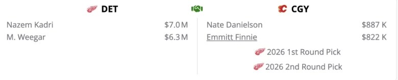 Similar to what we saw earlier this season with packaging Rasmus Andersson and Nazem Kadri together, I’m a hard stop on packaging Kadri and Mackenzie Weegar. You would likely get more if you traded them separately. While this futures-heavy package is enticing, especially Nate Danielson, it’s not enough to move both to Detroit.