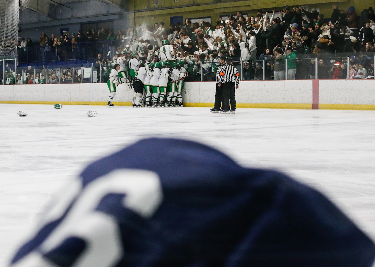 EJ Scherer (31) of Paramus-Lyndhurst-Mahwah celebrates after winning the Big North Silver Cup boys ice hockey game between Clifton and Paramus-Lyndhurst-Mahwah at the Ice Vault in Wayne, NJ on Friday, February 13, 2026.Mile Djordjiovski | For NJ.com