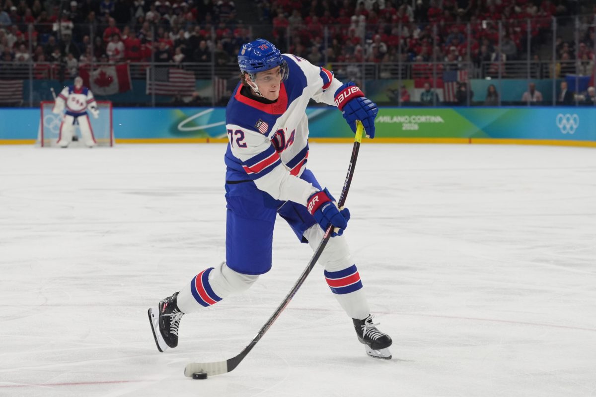 Feb 22, 2026; Milan, Italy; Tage Thompson (72) of the United States in action against Canada in the men’s ice hockey gold medal game during the Milano Cortina 2026 Olympic Winter Games at Milano Santagiulia Ice Hockey Arena. Mandatory Credit: Amber Searls-Imagn Images