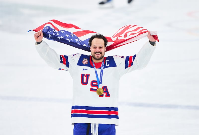 Auston Matthews MILAN, ITALY – FEBRUARY 22: Auston Matthews of Team United States celebrate the victory and Gold Medal during the Men`s Ice Hockey final match between USA and Canada on day sixteen of the Milano Cortina 2026 Winter Olympic games at Milano Santagiulia Ice Hockey Arena on February 22, 2026 in Milan, Italy. (Photo by EyesWideOpen/Getty Images) (EyesWideOpen/Getty Images)