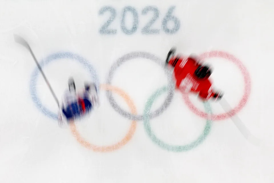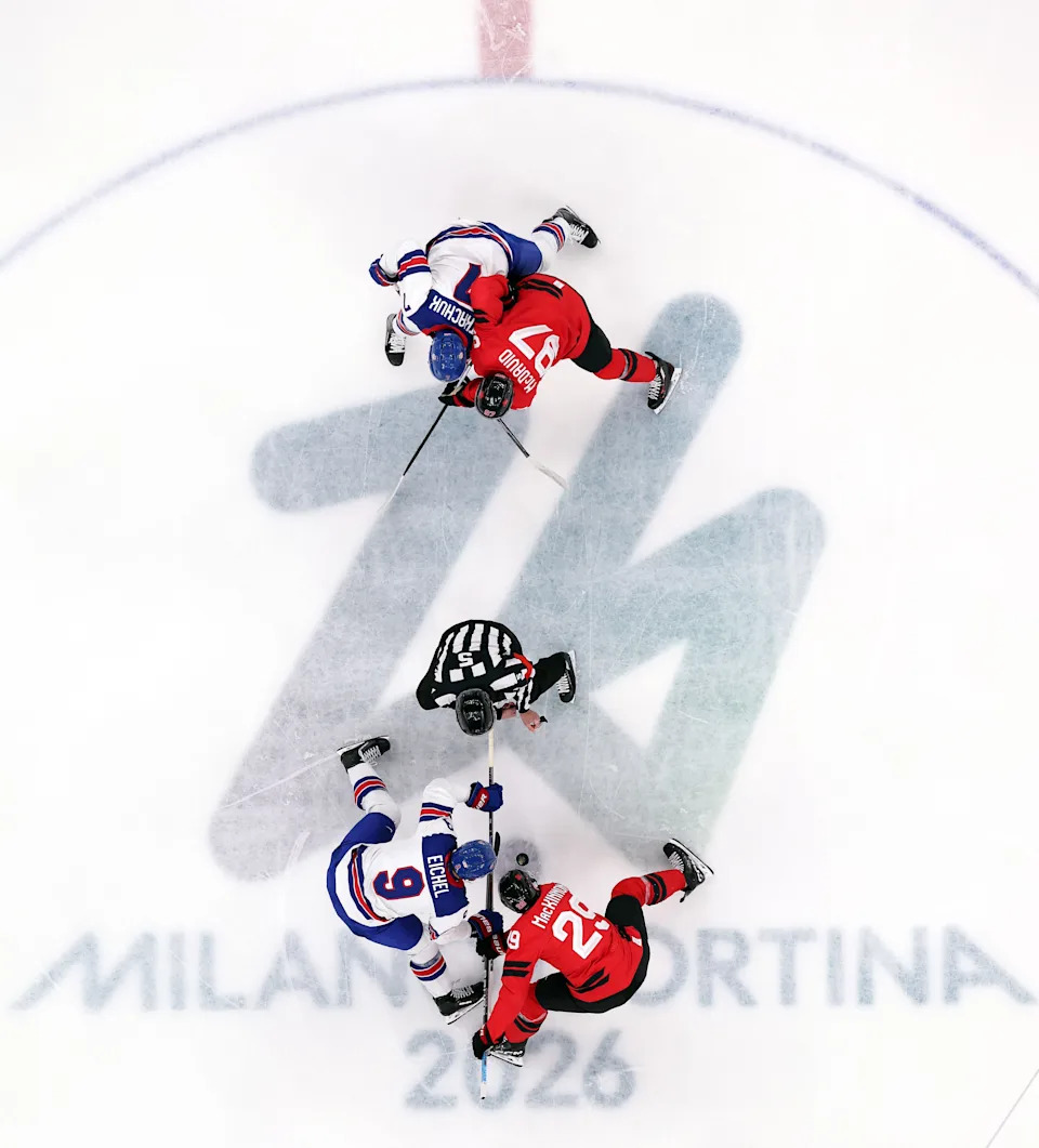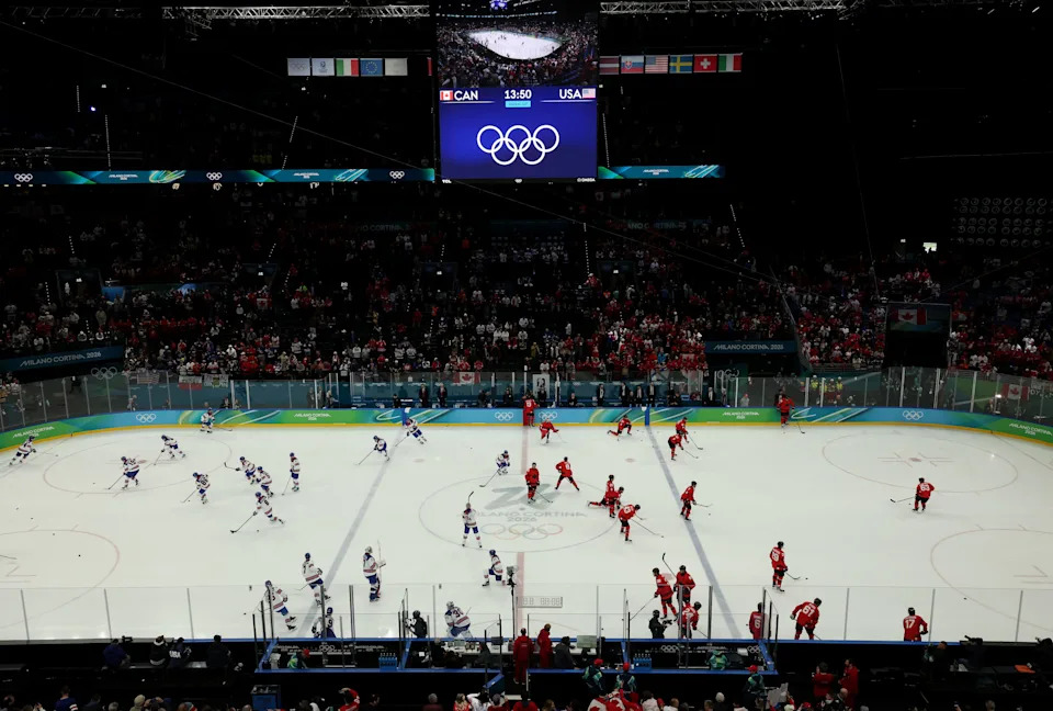 Players of Team United States and Team Canada warm up prior to the Men’s Gold Medal match between Canada and the United States on day 16 of the Milano Cortina 2026 Winter Olympic games at Milano Santagiulia Ice Hockey Arena on Feb. 22, 2026 in Milan, Italy.