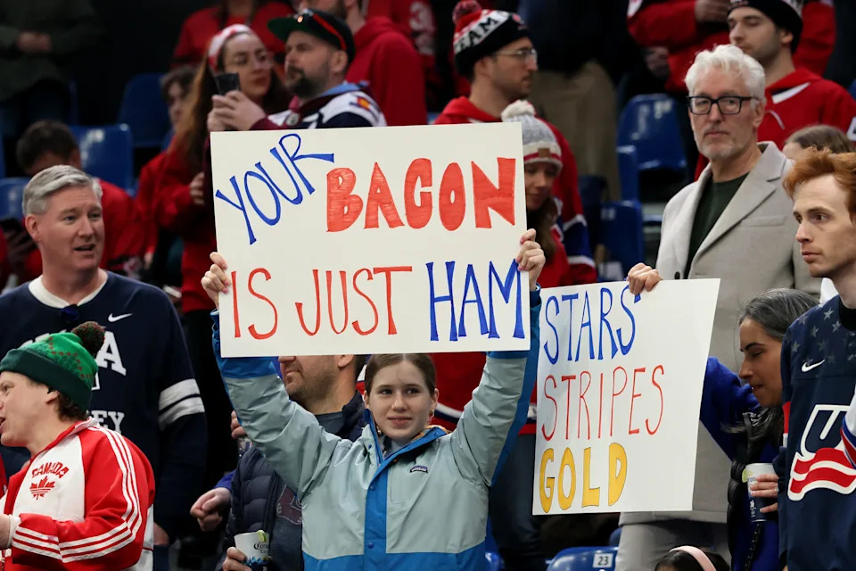 Fans of Team United States hold up signs prior to the Men’s Gold Medal match between Canada and the United States on day 16 of the Milano Cortina 2026 Winter Olympic games at Milano Santagiulia Ice Hockey Arena on Feb. 22, 2026 in Milan, Italy.