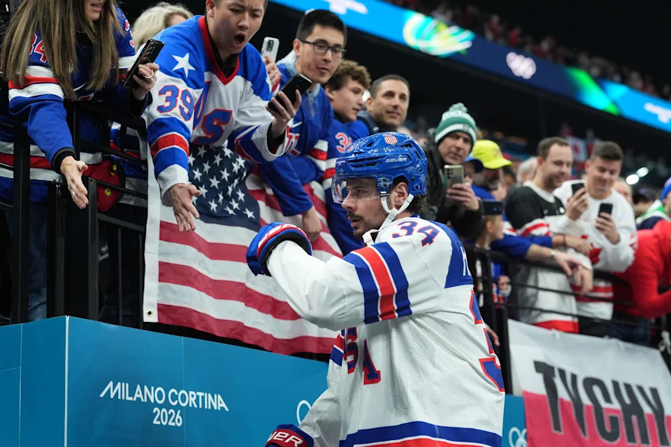 Auston Matthews of the United States greets fans before playing against Canada in the men’s ice hockey gold medal game during the Milano Cortina 2026 Olympic Winter Games at Milano Santagiulia Ice Hockey Arena.