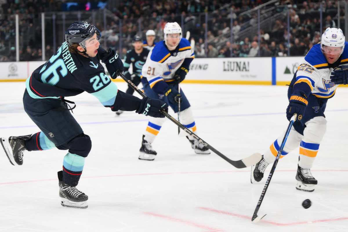 Apr 12, 2025; Seattle, Washington, USA; Seattle Kraken center Ryan Winterton (26) shoots the puck against the St. Louis Blues during the second period at Climate Pledge Arena. Mandatory Credit: Steven Bisig-Imagn Images