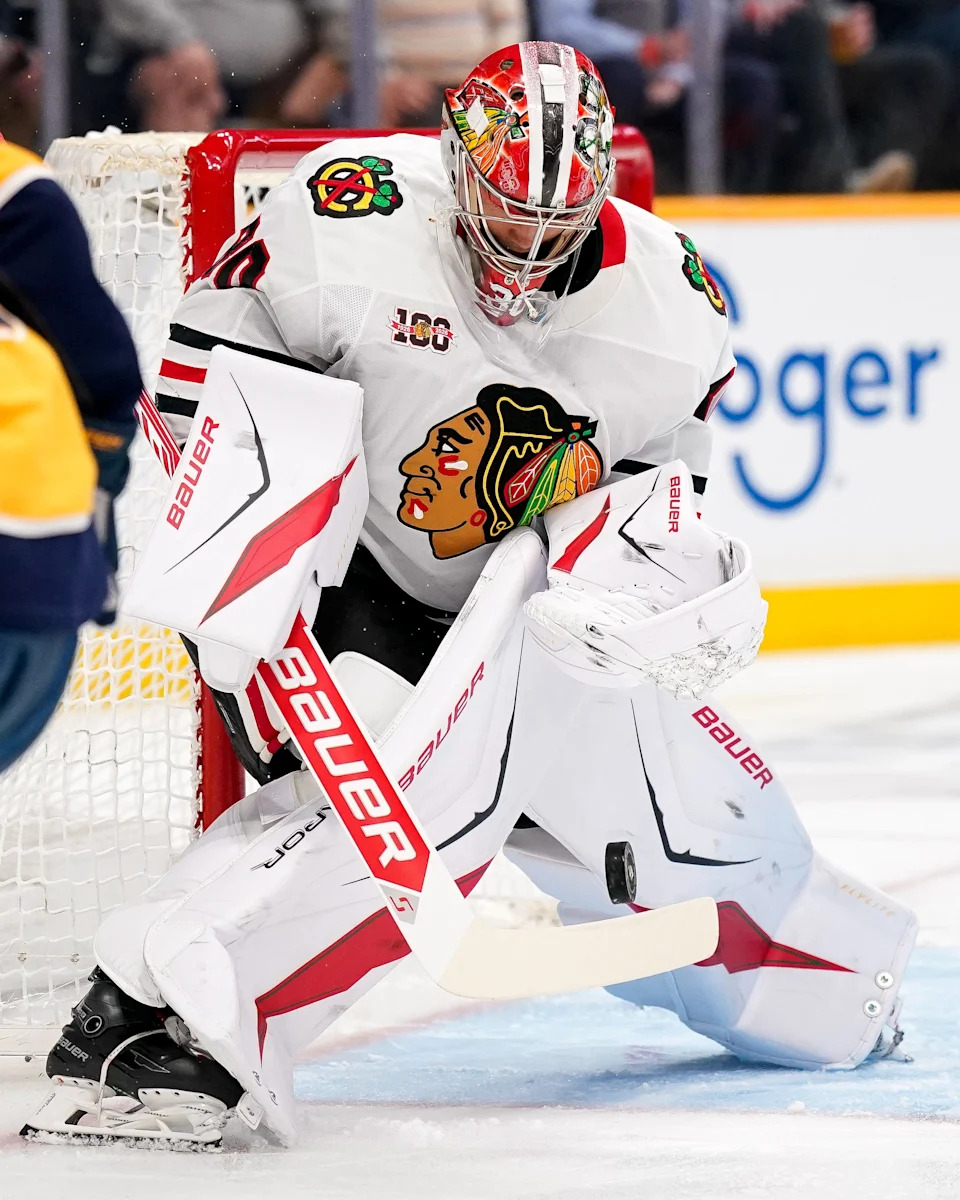 Chicago Blackhawks goaltender Spencer Knight (30) defends against the Nashville Predators during the first period at Bridgestone Arena in Nashville, Tenn., Thursday, Feb. 26, 2026.