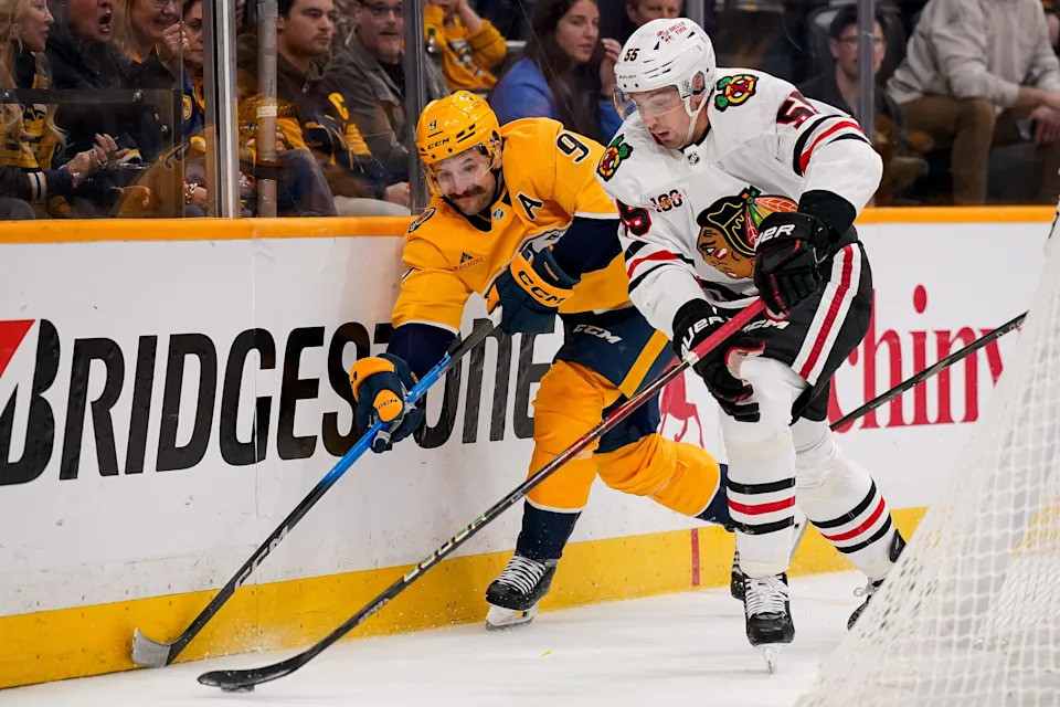 Nashville Predators left wing Filip Forsberg (9) fights for the puck with Chicago Blackhawks defenseman Artyom Levshunov (55) during the first period at Bridgestone Arena in Nashville, Tenn., Thursday, Feb. 26, 2026.