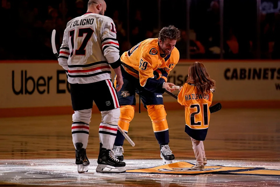Nashville Predators defenseman Roman Josi (59) hands the puck to pediatric cancer ambassador Ellie Hazlewood after a ceremonial puck drop before a game against the Chicago Blackhawks at Bridgestone Arena in Nashville, Tenn., Thursday, Feb. 26, 2026.