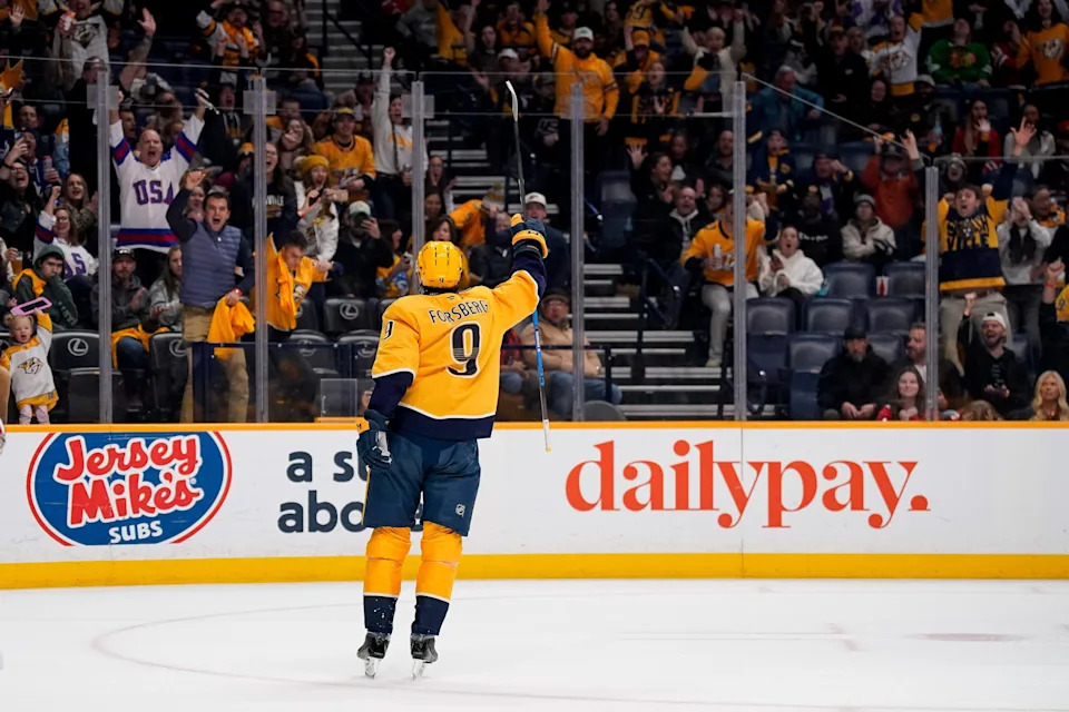 Nashville Predators left wing Filip Forsberg (9) celebrates his goal against the Chicago Blackhawks during the first period at Bridgestone Arena in Nashville, Tenn., Thursday, Feb. 26, 2026.