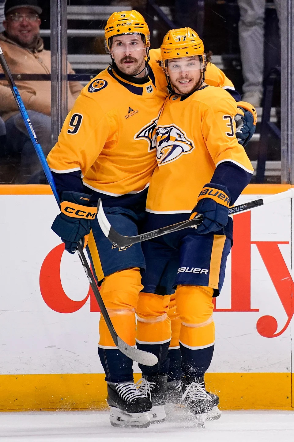 Nashville Predators left wing Filip Forsberg (9) celebrates his goal against the Chicago Blackhawks with defenseman Nick Blankenburg (37) during the first period at Bridgestone Arena in Nashville, Tenn., Thursday, Feb. 26, 2026.