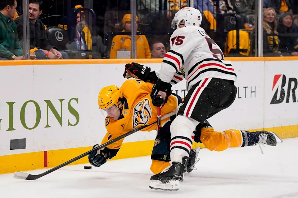 Nashville Predators right wing Luke Evangelista (77) trips chasing the puck with Chicago Blackhawks defenseman Artyom Levshunov (55) during the first period at Bridgestone Arena in Nashville, Tenn., Thursday, Feb. 26, 2026.