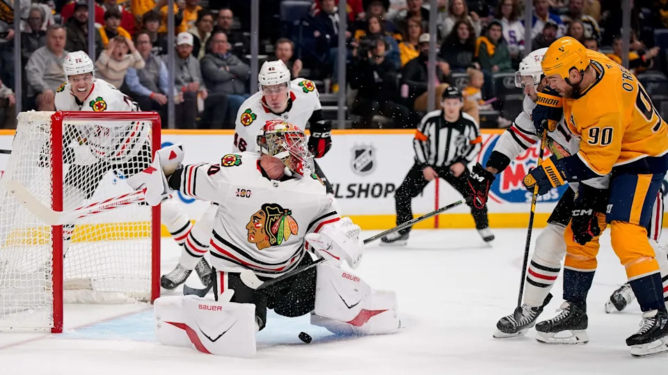 Chicago Blackhawks goaltender Spencer Knight (30) defends against Nashville Predators center Ryan O’Reilly (90) during the first period at Bridgestone Arena in Nashville, Tenn., Thursday, Feb. 26, 2026.