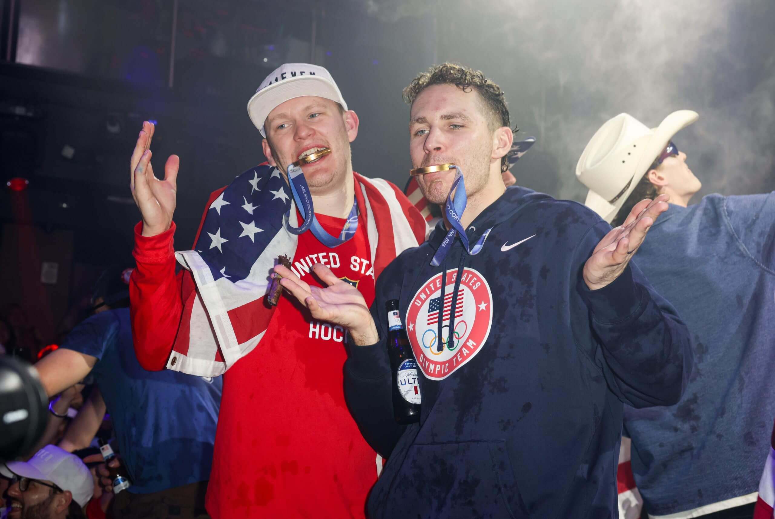 Brady Tkachuk and Matthew Tkachuk attend a celebration of Team USA’s gold medal in Olympic men’s hockey in Miami, Fla. (Alexander Tamargo / Getty Images for E11EVEN Miami)