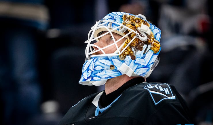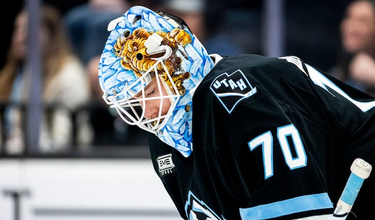 Utah Mammoth goaltender Karel Vejmelka (70) takes a moment between the action against the Minnesota Wild during an NHL game held at the Delta Center in Salt Lake City on Friday, Feb. 27, 2026. | Isaac Hale, Deseret News
