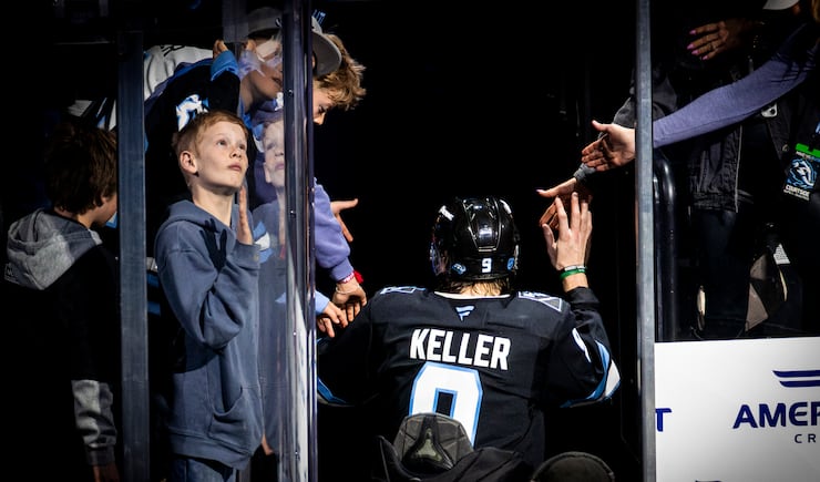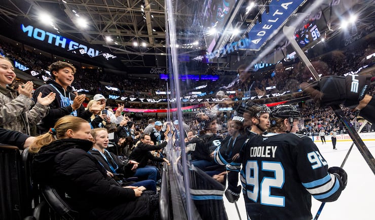 Utah Mammoth right wing Clayton Keller (9) high-fives fans after he gave an interview as part of the player of the game segment after the Mammoth defeated the Minnesota Wild in an NHL game held at the Delta Center in Salt Lake City on Friday, Feb. 27, 2026. | Isaac Hale, Deseret News