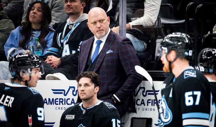 Utah Mammoth head coach André Tourigny scans the ice during a break in the action against the Minnesota Wild in an NHL game held at the Delta Center in Salt Lake City on Friday, Feb. 27, 2026. | Isaac Hale, Deseret News