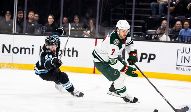 Minnesota Wild defenseman Brock Faber (7) controls the puck as Utah Mammoth left wing Michael Carcone (53) pursues him during an NHL game held at the Delta Center in Salt Lake City on Friday, Feb. 27, 2026. | Isaac Hale, Deseret News