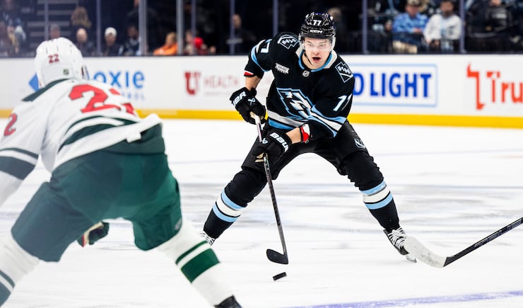 Utah Mammoth right wing JJ Peterka (77) controls the puck against the Minnesota Wild during an NHL game held at the Delta Center in Salt Lake City on Friday, Feb. 27, 2026. | Isaac Hale, Deseret News